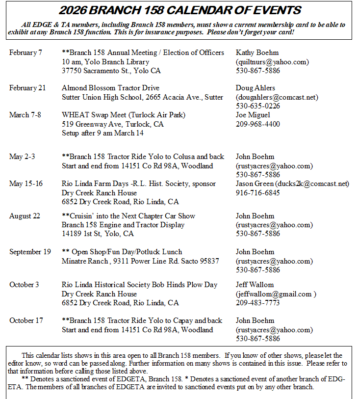 The Baling Wire is the official newsletter of Branch 158. It provides members with reports of past events, calendar of coming events, letters, ads, club information, and tips for the restoration and preservation of vintage farm, mining, construction, and related machinery. There is no charge for ads in the Baling Wire. All ads must be related to antique engines/tractors. For sale ads will be accepted from anyone, regardless of EDGE & TA membership. Wanted ads will be accepted only from EDGE & TA members. Your input for the Baling Wire is most welcome. Send to John Boehm, Editor, 14151 County Road 98A, Woodland, CA 95695-9134; e-mail: rustyacres@yahoo.com.